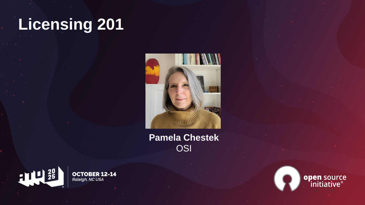 在 2025/10,開放原始碼促進會(Open Source Initiative1,OSI) 在 All Things Open 大會中主辦了 State of the Source 議程,旨在讓開發者與正在形塑我們生態系的重要政策議題建立連結。OSI 榮譽董事會成員 Pamela Chestek2 以「Licensing 201」為該專題揭開序幕,深入且實務地探討授權條款是如何獲得核准的,以及為何做出正確的授權選擇對社群生態至關重要。